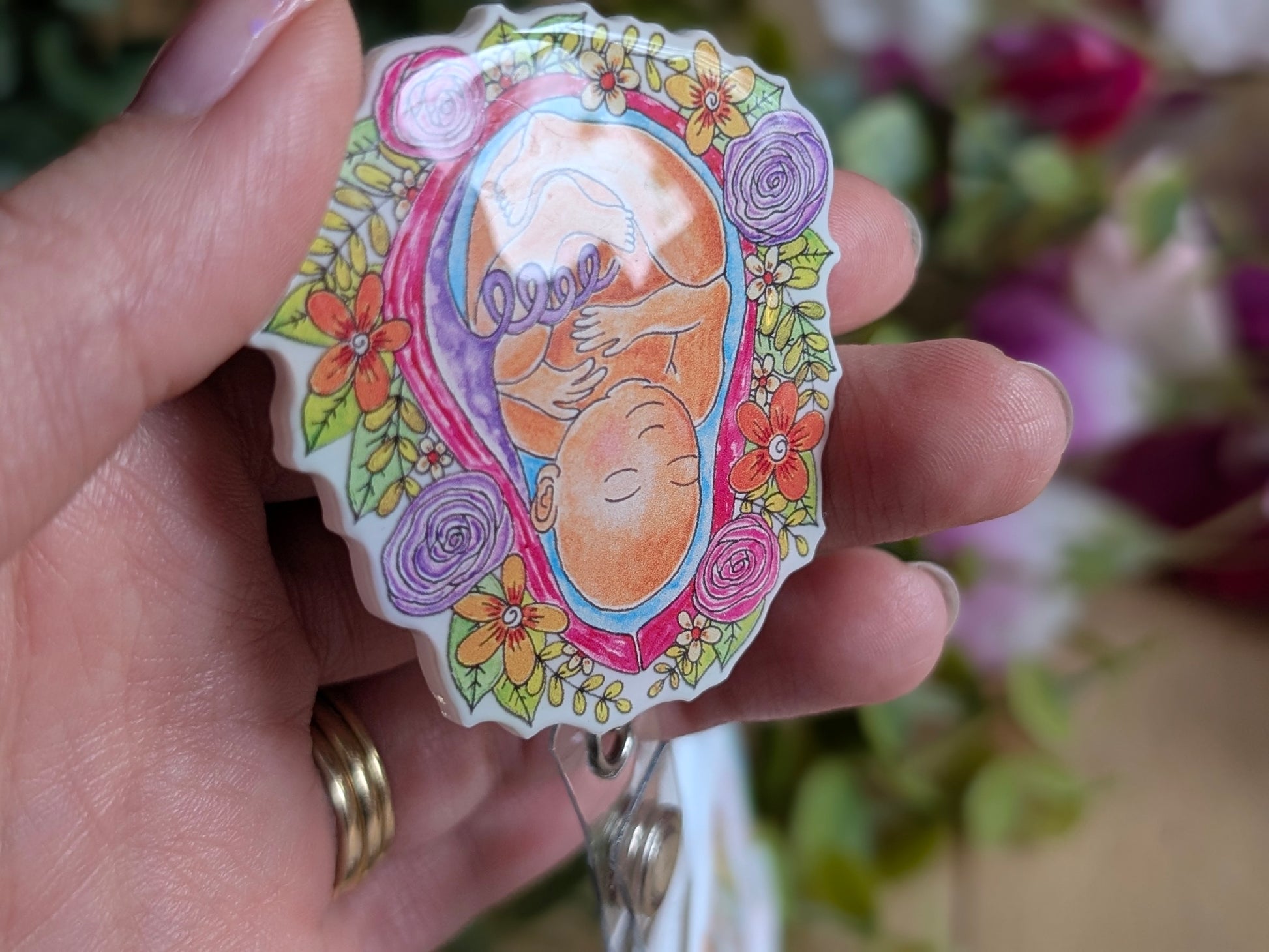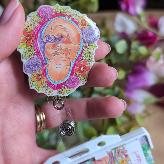 Wear your midwife, maternity support worker or labor and delivery nurse ID card with pride on a pocket, belt or bag with a retractable baby in the womb art badge reel ID card holder. My watercolour baby painting has been printed on recycled plastic in the UK, and I've attached to a plastic retractable badge reel.