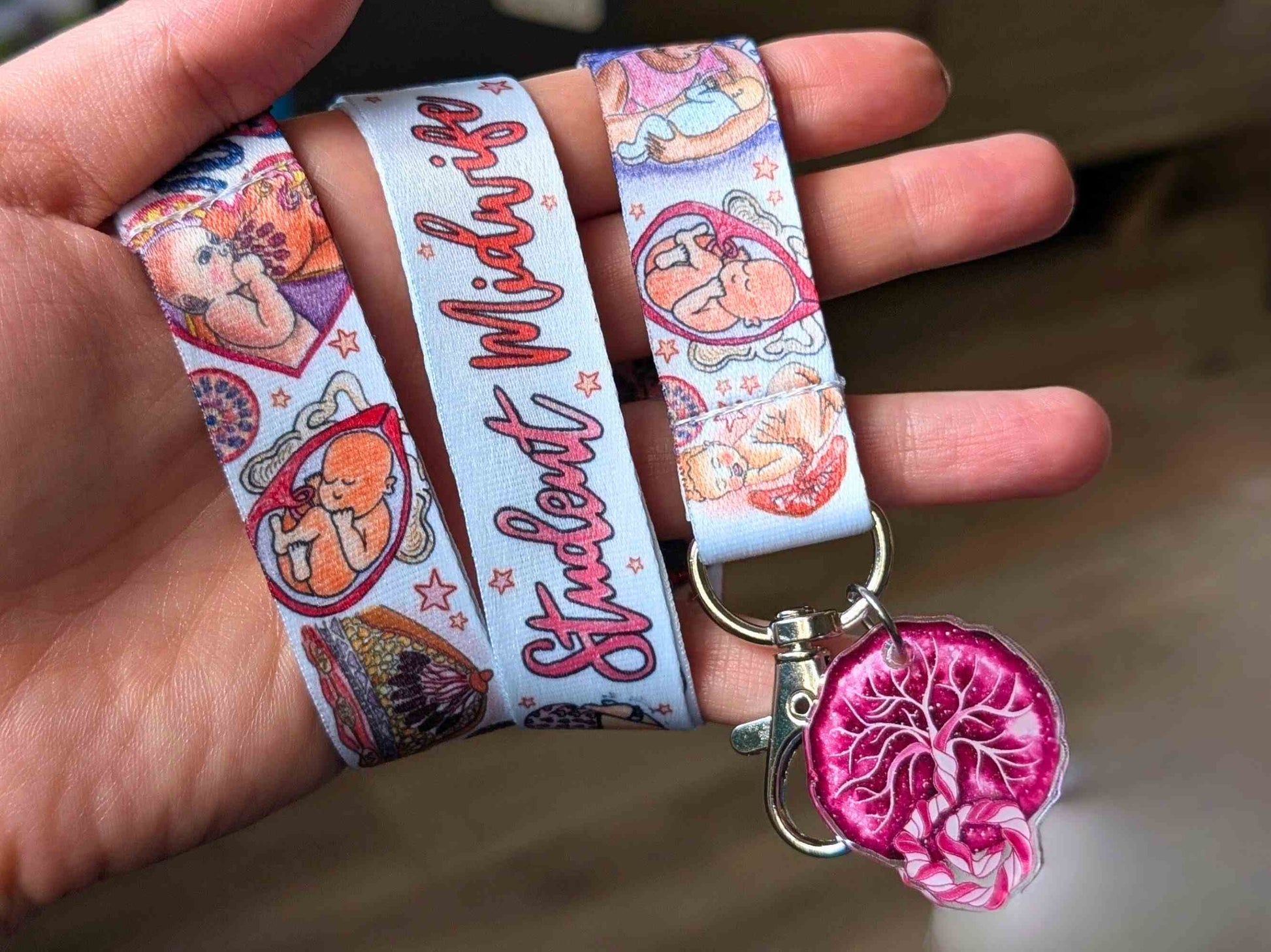 Wear your student midwife ID card with pride on a premium-quality, soft-touch fabric lanyard that is durable and comfortable and covered in my watercolour birth, baby and breastfeeding art.